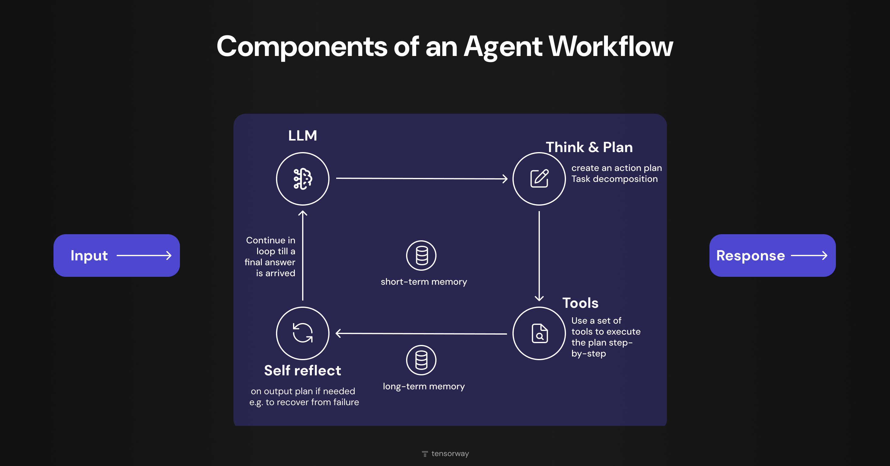 An agent’s workflow is inherently cyclical. The system goes beyond simple task execution. It decomposes the task, remembers past actions, and actively course-corrects. It can update the plan if needed to deliver the desired output.