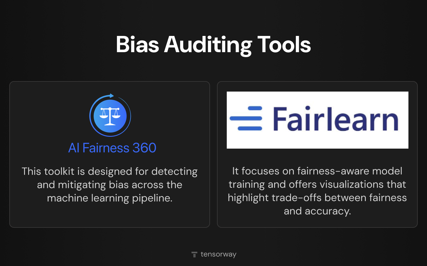 - Microsoft’s FairLearn. It focuses on fairness-aware model training and offers visualizations that highlight trade-offs between fairness and accuracy.