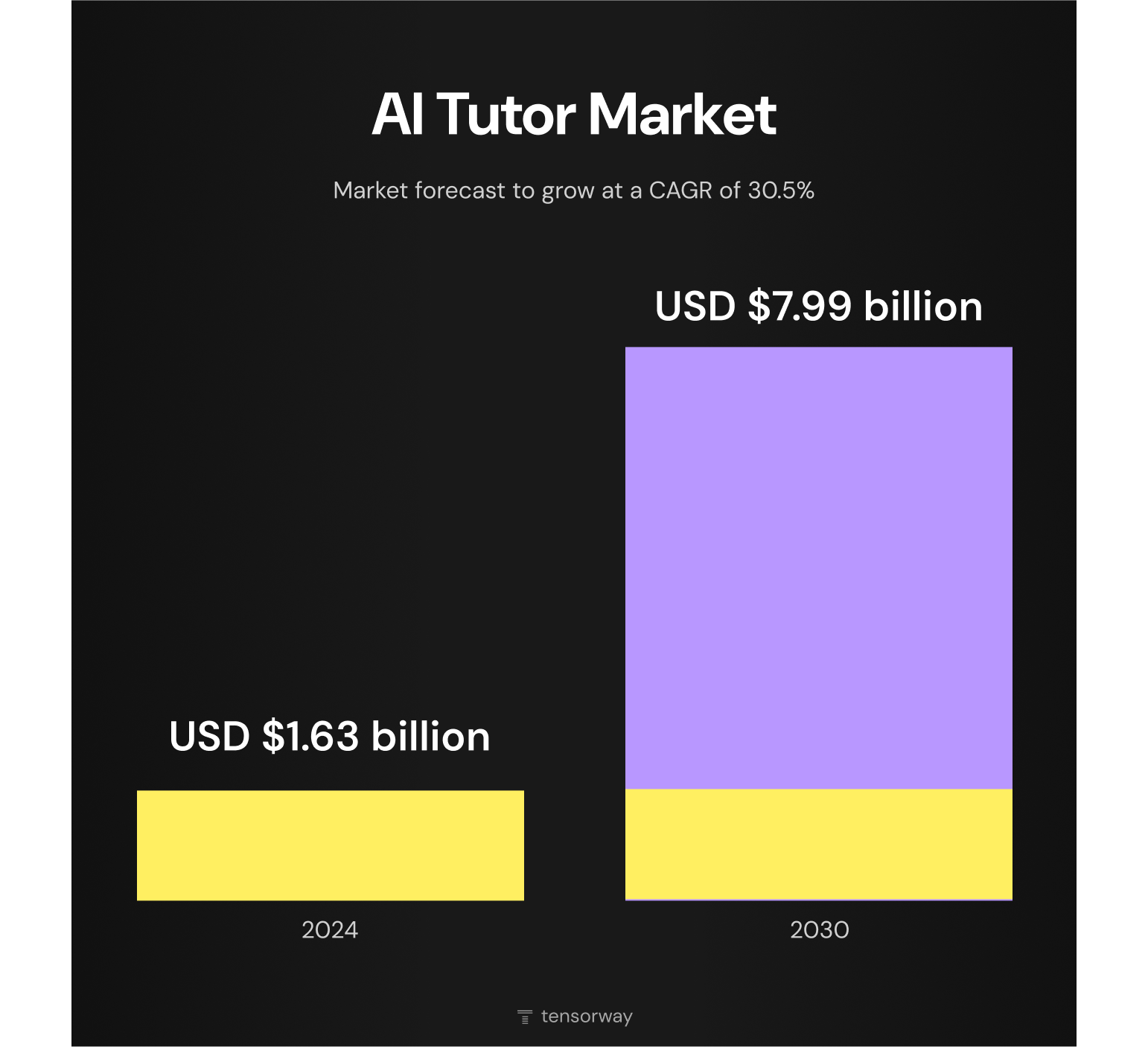 In 2024, the global AI tutor market achieved a size of $1.63 billion. Now, it is expected to grow at a CAGR of 30.5% within the period from 2025 to 2030. It means that by 2030, it will be able to hit the mark of $7.99 billion.