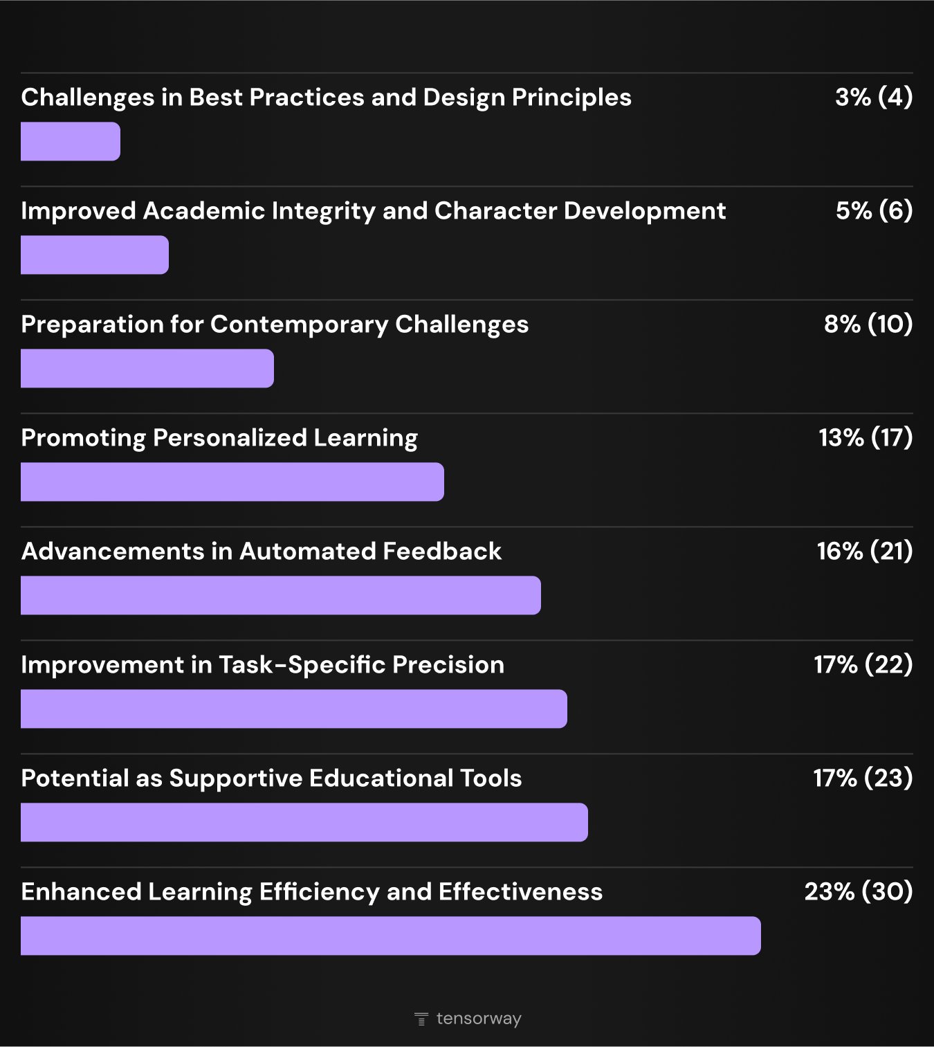 The image below demonstrates the impact of integrating LLMs in higher education. According to the conducted study, large language models positively influence learning efficiency and effectiveness. They are recognized as valuable tools to provide preliminary feedback and promote personalized learning.