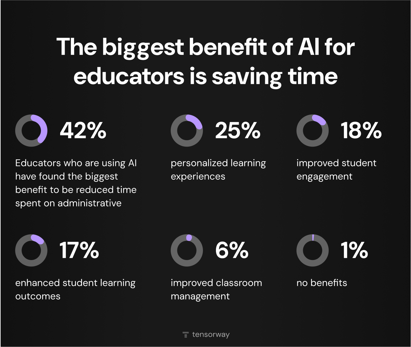 - Efficient automation and time saving. AI can perform repetitive tasks like grading quizzes, generating reports, and tracking student progress. With such functionality, teachers can have more free time for lesson planning and interaction with students. It’s interesting that more than 40% of educators who use AI name time saving as the biggest benefit of this technology.