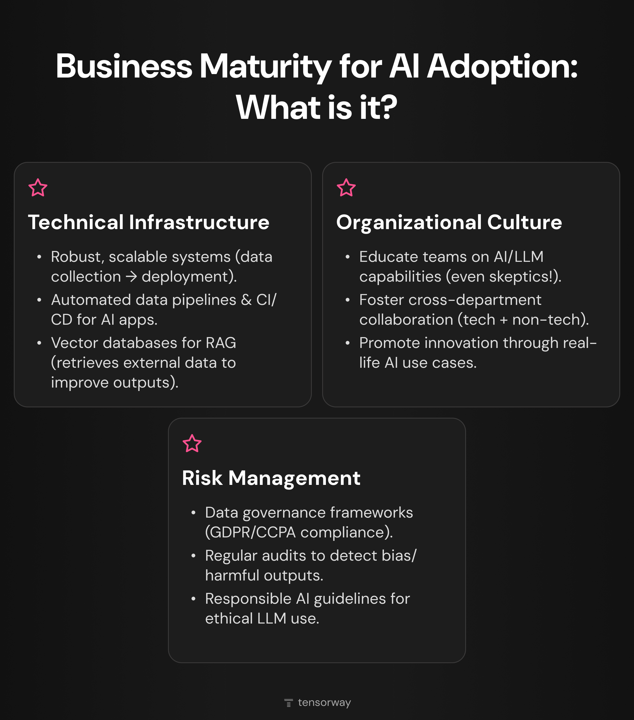 Business maturity in the context of integrating AI tools and LLMs can be explained as a measurement of an organization’s strategic, technical, and operational readiness to effectively implement and scale such solutions. In this context, it’s vital to understand that business maturity is not only about technology. It is also about processes, teams, and culture.