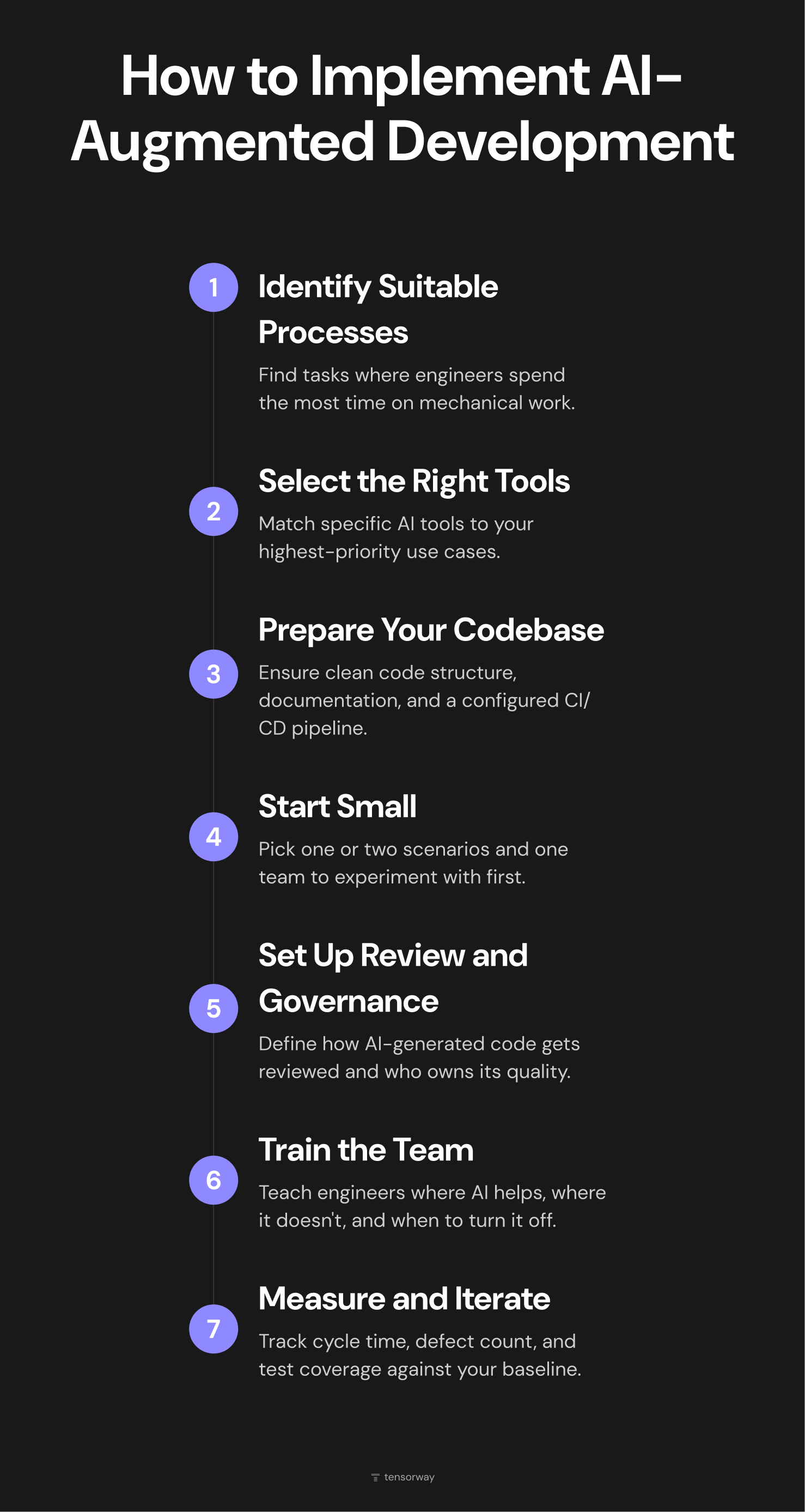 Define how AI-generated code goes through review. Who owns its quality? Is there a separate checklist for reviewing AI code? Does security scanning run automatically? These questions are better answered before AI-generated code starts flowing into production at scale. Teams offering AI augmented development services typically build this governance layer in from the beginning.